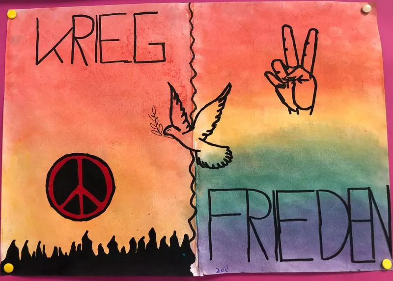 Aufsteller, Anstecker und Collagen erstellt sowie Geschichten gelesen, vorgelesen oder geschrieben. Manche Klassen sangen Friedenslieder aus unterschiedlichen Ländern. Sie analysierten die Liedtexte